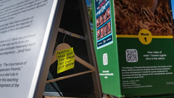 One of the displays was vandalized with permanent marker shortly after it was put up. An App State Police officer later washed the message off. Someone also placed clothes hangers around the display with sticky notes that read, “abortion bans don’t stop abortions they stop safe abortions.”